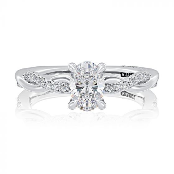 Coming from our A.JAFFE Classics Collection. crafted to represent class and luxury, this four prong engagement ring sits a oval cut center diamond. The band features a stunning intertwined pave diamond set shank. Made for the modern bride, our Signature Shank on the band to ensure the ring stays centred and upright.