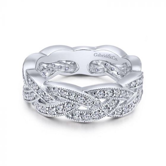 Three delicate strands of diamonds intertwine to create a distinctive braided texture in this stackable fashion ring. Fashioned from classic 14K white gold and finished with elegant milgrain borders, this 0.52ct diamond stackable ring is a timeless beauty.