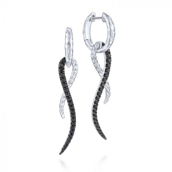 925 Sterling Silver Black Spinel Twisted Criss Cross Huggie Drop Earrings