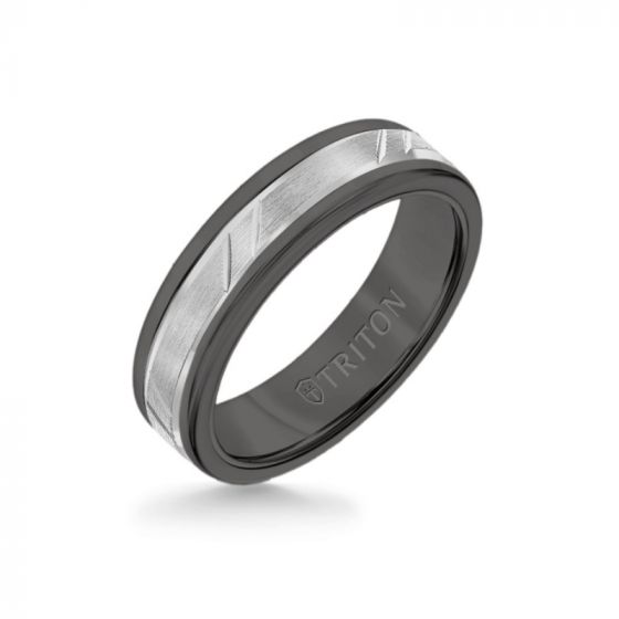 Triton 6MM Black Tungsten Carbide Ring - Bevel Diagonal Cut 14K White Gold Insert with Round Edge