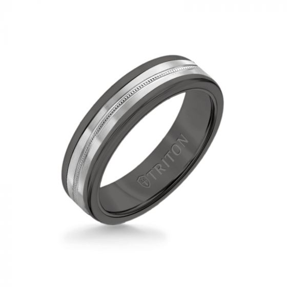Triton 6MM Black Tungsten Carbide Ring - Center Milgrain 14K White Gold Insert with Round Edge