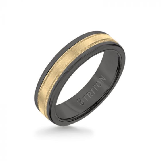 Triton 6MM Black Tungsten Carbide Ring - Flat Milgrain 14K Yellow Gold Insert with Round Edge