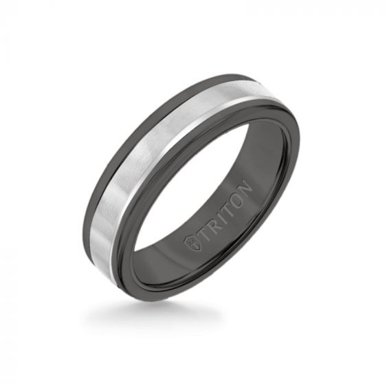 Triton 6MM Black Tungsten Carbide Ring - Linear 14K White Gold Insert with Round Edge
