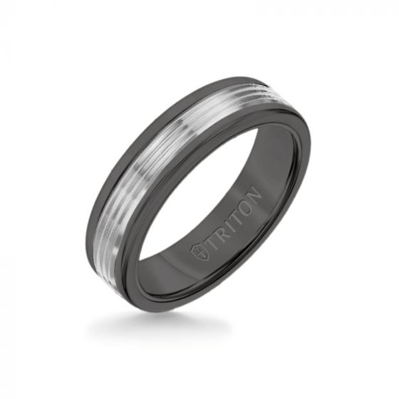 Triton 6MM Black Tungsten Carbide Ring - Serrated Engraved 14K White Gold Insert with Round Edge