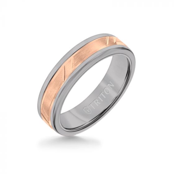 Triton 6MM Grey Tungsten Carbide Ring - Bevel Diagonal Cut 14K Rose Gold Insert with Round Edge