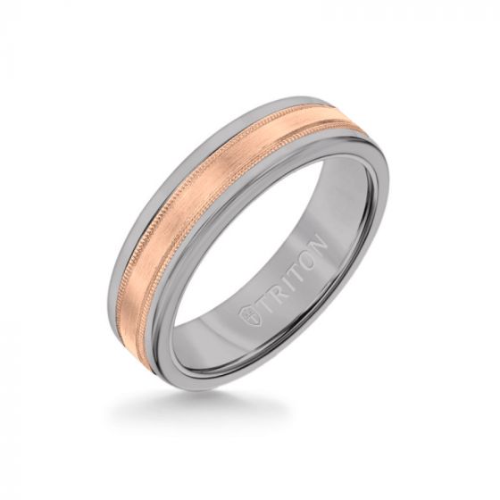 Triton 6MM Grey Tungsten Carbide Ring - Flat Milgrain 14K Rose Gold Insert with Round Edge