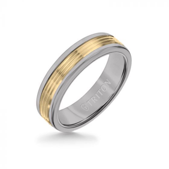 Triton 6MM Grey Tungsten Carbide Ring - Serrated Engraved 14K Yellow Gold Insert with Round Edge