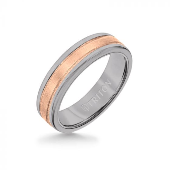 Triton 6MM Grey Tungsten Carbide Ring - Step Edge 14K Rose Gold Insert with Round Edge