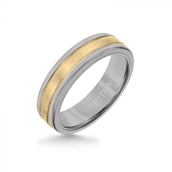 Triton 6MM Grey Tungsten Carbide Ring - Step Edge 14K Yellow Gold Insert with Round Edge