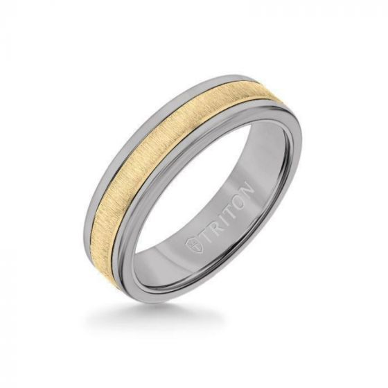 Triton 6MM Grey Tungsten Carbide Ring - Vertical Satin 14K Yellow Gold Insert with Round Edge