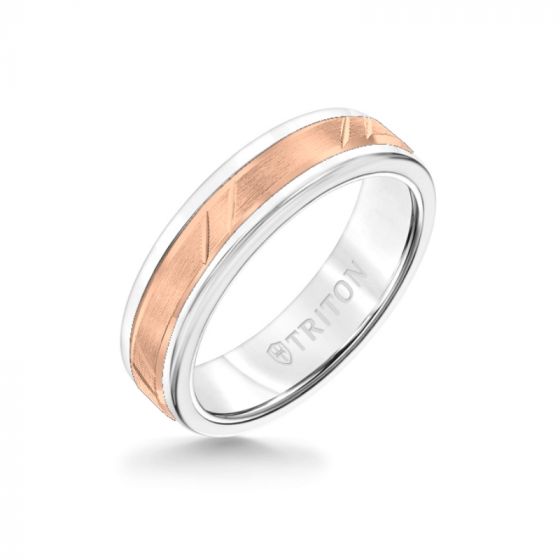 Triton 6MM White Tungsten Carbide Ring - Bevel Diagonal Cut 14K Rose Gold Insert with Round Edge