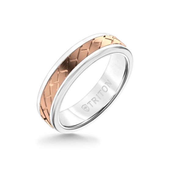 Triton 6MM White Tungsten Carbide Ring - Diagonal Brick 14K Rose Gold Insert with Round Edge