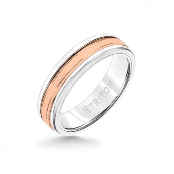 Triton 6MM White Tungsten Carbide Ring - Double Engraved 14K Rose Gold Insert with Round Edge