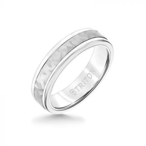 Triton 6MM White Tungsten Carbide Ring - Hammered 14K White Gold Insert with Round Edge
