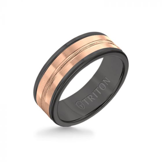 Triton 8MM Black Tungsten Carbide Ring - Center Milgrain 14K Rose Gold Insert with Round Edge