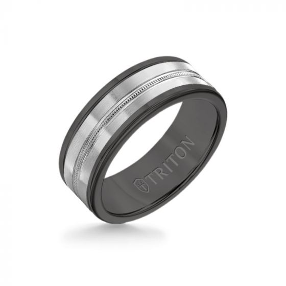 Triton 8MM Black Tungsten Carbide Ring - Center Milgrain 14K White Gold Insert with Round Edge