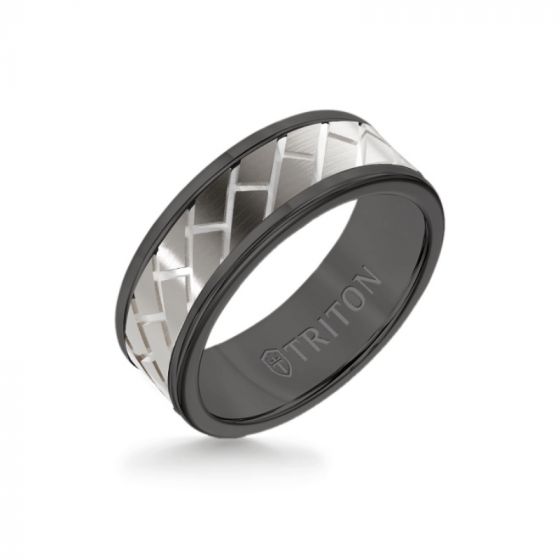 Triton 8MM Black Tungsten Carbide Ring - Diagonal Brick 14K White Gold Insert with Round Edge