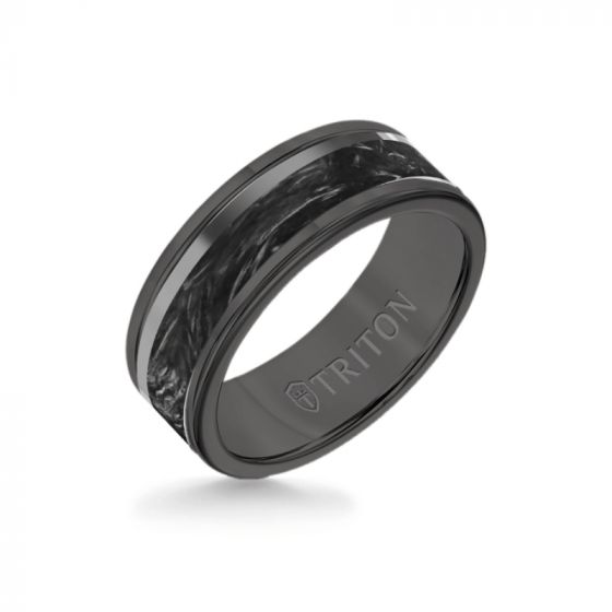 Triton 8MM Black Tungsten Carbide Ring - Forged Carbon and Titanium Off Center Insert with Round Edge