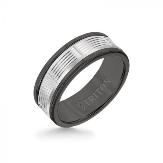 Triton 8MM Black Tungsten Carbide Ring - Serrated Vertical Cut 14K White Gold Insert with Round Edge