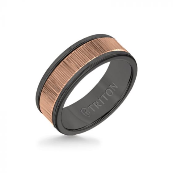 Triton 8MM Black Tungsten Carbide Ring - Vertical Geometric 14K Rose Gold Insert with Round Edge
