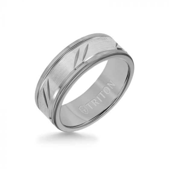 Triton 8MM Grey Tungsten Carbide Ring - Bevel Diagonal Cut 14K White Gold Insert with Round Edge