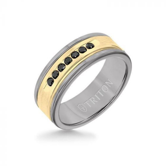 Triton 8MM Grey Tungsten Carbide Ring - Black Diamonds 14K Yellow Gold Insert with Round Edge