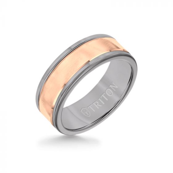 Triton 8MM Grey Tungsten Carbide Ring - Linear 14K Rose Gold Insert with Round Edge