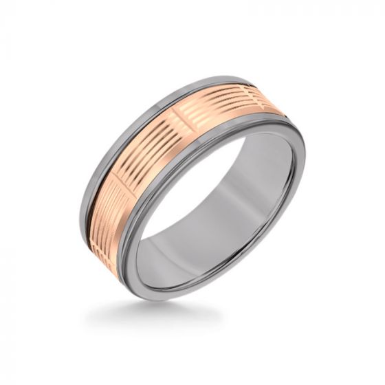 Triton 8MM Grey Tungsten Carbide Ring - Serrated Vertical Cut 14K Rose Gold Insert with Round Edge