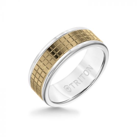 Triton 8MM White Tungsten Carbide Ring - Cubed 14K Yellow Gold Insert with Round Edge
