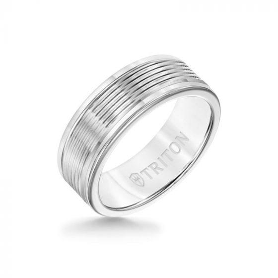 Triton 8MM White Tungsten Carbide Ring - Serrated Engraved 14K White Insert with Round Edge