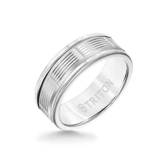 Triton 8MM White Tungsten Carbide Ring - Serrated Vertical Cut 14K White Gold Insert with Round Edge