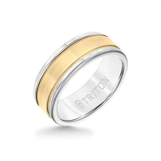 Triton 8MM White Tungsten Carbide Ring - Step Edge 14K Yellow Gold Insert with Round Edge