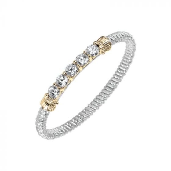 4 millimeter sterling silver and 14k gold, bar bracelet with cubic zirconia stones. Slender yet radiant! This bar bracelet is instantly recognized for the intricacy of interplay between sparkling gemstones and the interweaving gold framework.