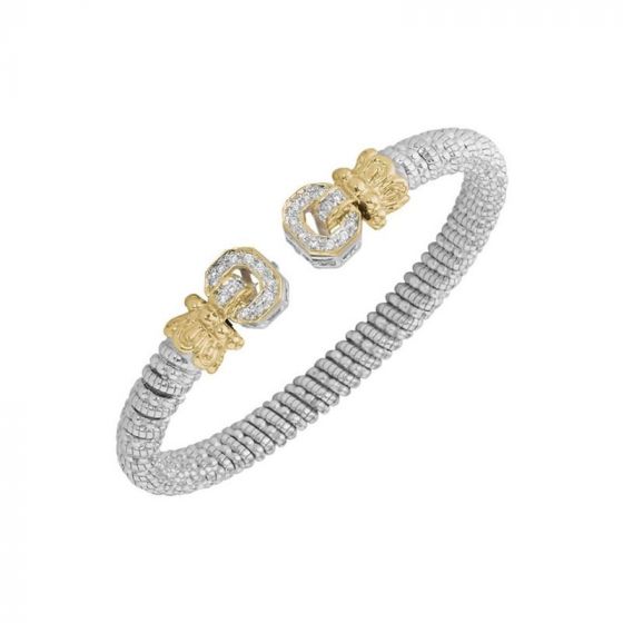 Another ladylike take on Vahan's signature style, this sterling silver and 14k yellow gold bracelet showcases .17cttw of stunning diamonds in the buckle style open ended tips.
