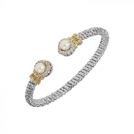 4 millimeter Sterling Silver and 14 Karat Gold bracelet with .18 Carats in diamonds with pearls. Introducing our new pearl tipped open bracelet. Here you have an exquisite set of pearls surrounded by .18 Carats of diamonds.