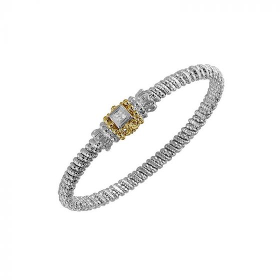 4 millimeter bracelet in sterling silver and 14k gold with .04 carats of diamonds. Simple elegance at its finest! This slender silver bangle offers just a touch of gold and glittering diamonds.