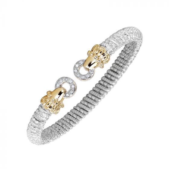 Dazzling open cut circles with pave diamonds and gold detailing 6 millimeter Sterling Silver, 14 Karat Gold bracelet with .14 Carats in Diamonds.