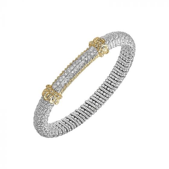 This stunning bar style bracelet is Sterling Silver And 14K Gold Bracelet flanking two rows of .75Ctw Pave Diamonds.
