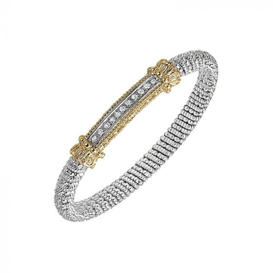 A classic top seller due to its simple and harmonious design, this bar bracelet is in sterling silver with 14k gold and .22 Carats in Diamonds.