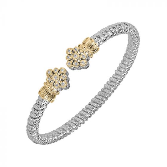 This elegant bracelet is sterling silver with 14k gold, with an open design and .15ctw of brilliant diamonds. The Signature Vahan sterling silver bracelet is open clasp with floral motif caps and acanthus detailing.