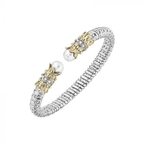 A sterling silver bracelet with 14k gold bracelet, pearl and .12 cttw in diamonds. Our 6 millimeter open bracelet with floral designs flanking luminous pearls. The silver band is adorned with Vahan's trademark twisted design with caviar beading,